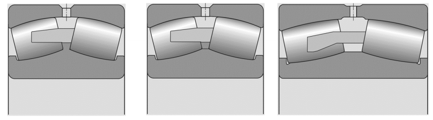 目前大尺寸調心滾子軸承已有結構如圖2所示,根據中隔圈的結構形式可分為固定中隔圈,浮動中隔圈和無中隔圈設計。相對于浮動中隔圈和無中隔圈的設計,固定中隔圈可以有效增加軸向剛度,降低在軸向力影響下的軸向移動距離,從而有效減少軸向力對齒輪箱的影響。同時固定中隔圈可以有效限制滾動體在移動時的擺動角度。而無中隔圈的設計的優勢在于可以更充分地利用內部空間從而設計更大的滾動體和接觸角,增加其軸向承載能力。