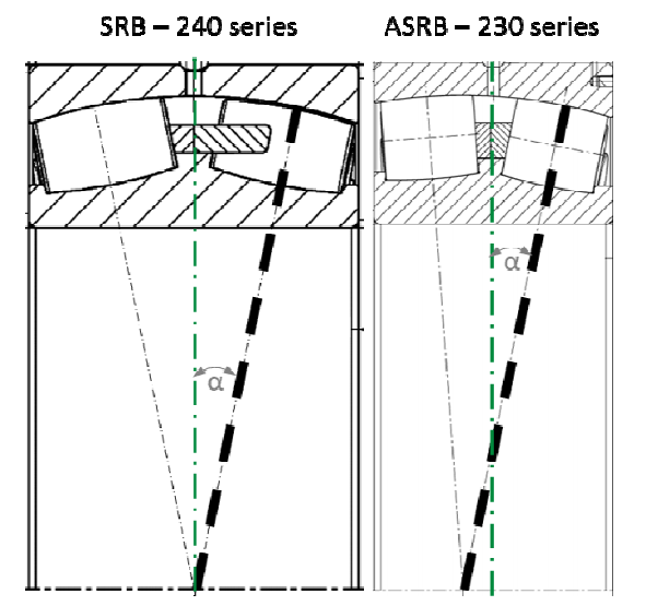 通過設置兩列滾動體的接觸角不同來滿足單向承載的需求。在與傳統對稱式結構相比,該設計能在相同外形尺寸下,有效提高軸承軸向承載能力和剛度,從而一定程度上有效避免了另外一列滾動體打滑的風險。對于風電應用來說,往往選擇240系列軸承是因為可以設計更大的接觸角以增大軸向承載能力,非對稱設計可以充分利用風力的單向性,提高對齒輪箱側的接觸角增大可行性,可以使用230系列去替代240系列軸承,如圖所示,以此來減小軸承的尺寸。