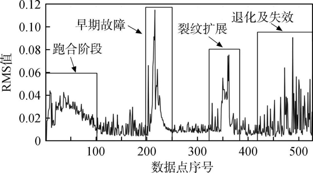 圖2 軸承全壽命實驗聲發射信號RMS值變化[43]