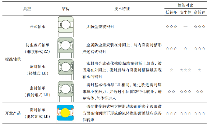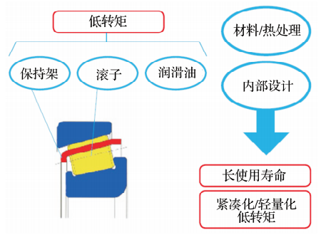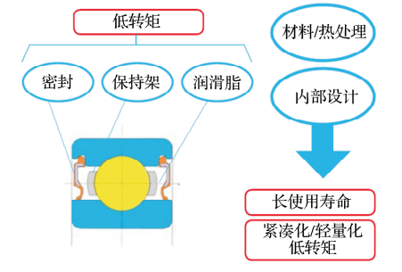 通過材料、熱處理、內(nèi)部設(shè)計參數(shù)的變化以及諸如密封、保持架、潤滑脂的改進(圖1),實現(xiàn)低轉(zhuǎn)矩的要求和緊湊化、輕量化的設(shè)計。