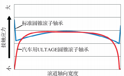 圓錐滾子軸承滾動接觸區(qū)域的接觸應(yīng)力最小化,并在滾子上采用特殊凸形減小接觸區(qū)域邊緣處過大的應(yīng)力(邊緣載荷)。滾道軸向截面接觸應(yīng)力分布計算示例如圖8所示。隨著ULTAGE圓錐滾子軸承在汽車上的應(yīng)用,通過采用特殊凸形抑制接觸區(qū)域的邊緣載荷和均衡整體接觸應(yīng)力分布,提高軸承使用壽命。