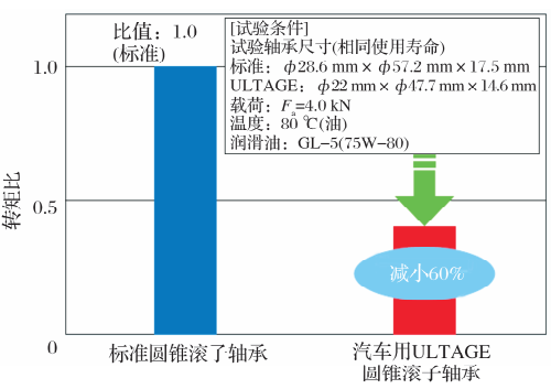 此外,基于全球可采購到的軸承鋼,開發(fā)了長壽命熱處理“FA工藝”。與標準系列相比,ULTAGE圓錐滾子軸承實現(xiàn)了更長的使用壽命和顯著減小的轉(zhuǎn)矩(圖4)。如稍后提到的接觸應(yīng)力分布優(yōu)化等改進,有助于延長壽命。